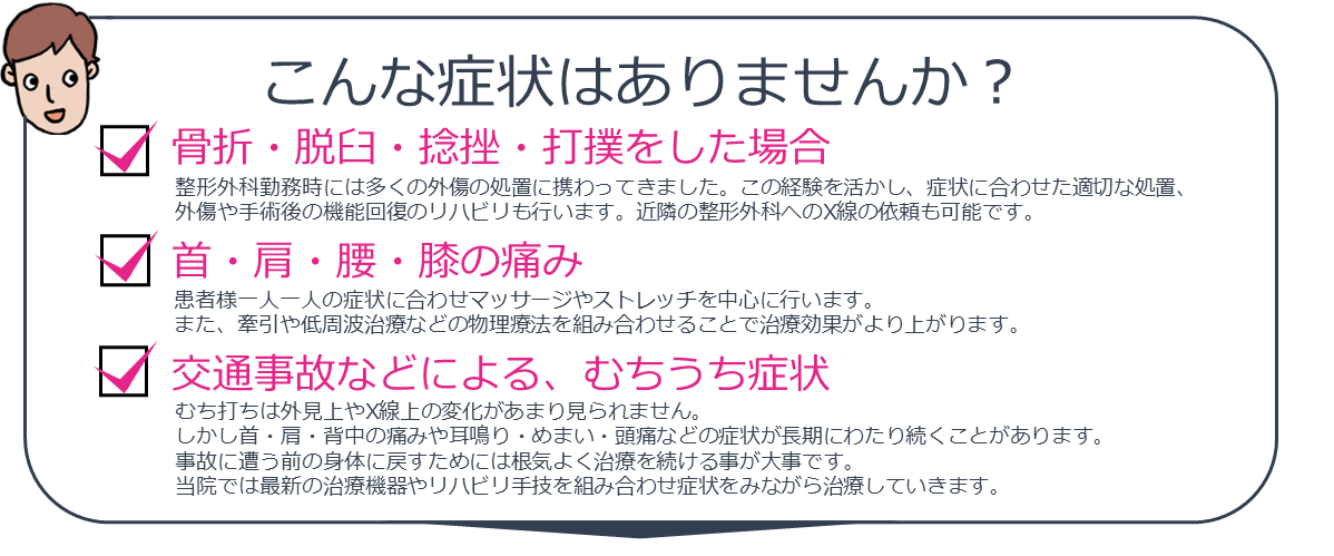 事故にあう前の元気な体に戻るお手伝いをさせていただきます。事故の衝撃による痛みは後から来る場合があります。むち打ちなどを癖にしないためにも早期からのケアが大切です。当院は多数の交通事故、外傷処置の経験があり確かな施術が受けられます。まずは痛みの段階、時期を見極め、最新の電気治療機器での物理療法、機能回復のリハビリ手技なども組み合わせて症状をみながら施術していきます。これらの施術は無料で受けていただけます。現在通っている病院、治療院がある方も転院できます。